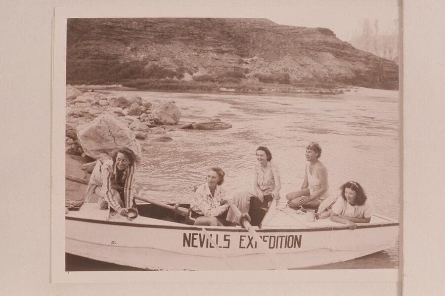 The women in the 1947 Nevills party between Lees Ferry and Bright Angel Creek. Foot of the Tanner Trail. L to R: Marjory Farquhar, Rosalind Johnson, Pauline Saylor, Margaret Marston and Elma Milotte