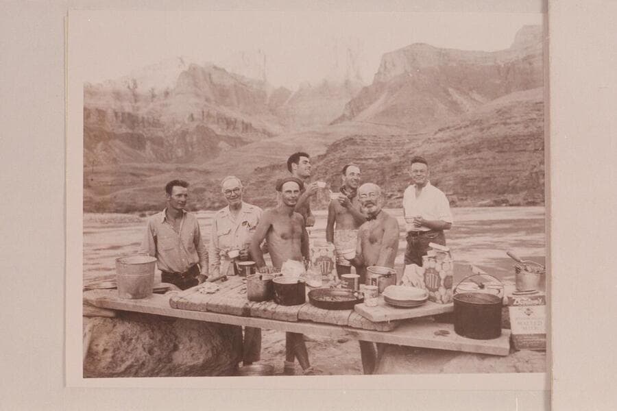 The men of the Nevills party in Grand Canyon- Lees Ferry to Bright Angel Creek. L to R: Frost, Henderson, Nevills, Garth Marston, Milotte, Marston and Farquhar. At the foot of the Tanner Trail