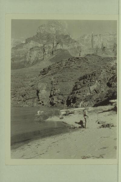 Camp at foot of Tanner Trail. The "Esmeralda II" is moored beyond the drift. Bestor Robinson watches the fire