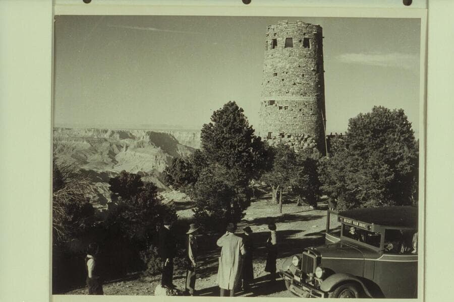 People looking at view by Desert View Drive bus, Grand Canyon