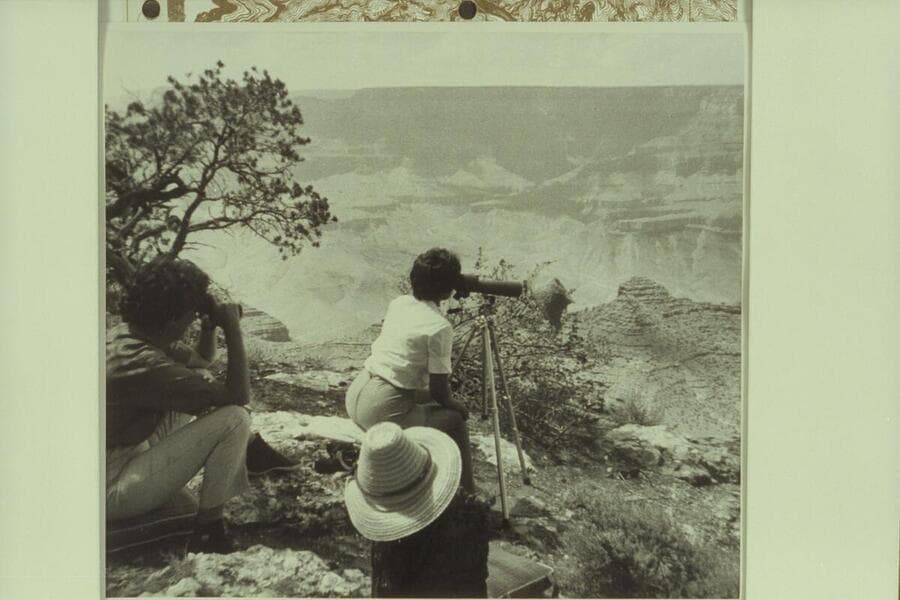 The Wrim Wrens at work near Desert View Tower. Unkar Creek upper center