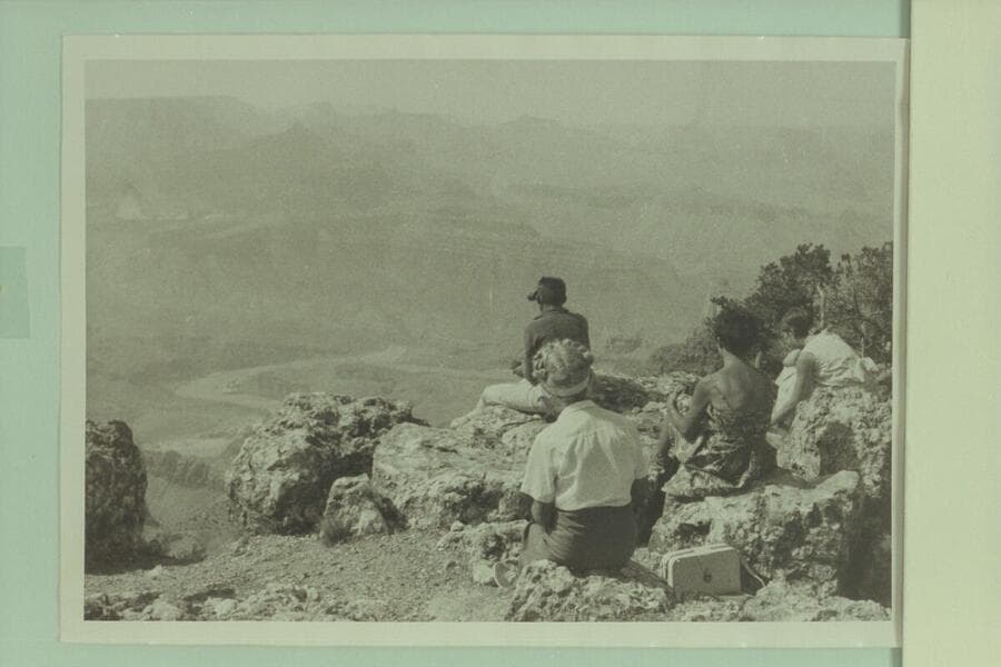 The Rim Runners watching the running of Unkar Rapid. Buzz Belknap with the glasses; Margaret Marston; Margie Mannering; Debbie Marston