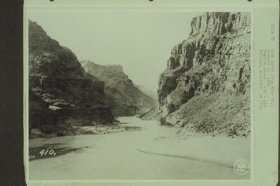 River through cleft in rock; Moran Point. The cleft is the mouth of 75 Mile Creek and shows the river from Mile 74 to Mile 75