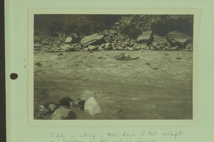 Parley Galloway riding Clyde Eddy through Hance Rapid. Eddy is sitting in the stern of the cockpit and holding to the splash shield
