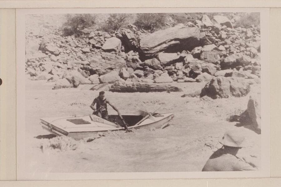 Norm Nevills in the "WEN" hung on a rock in Hance Rapid