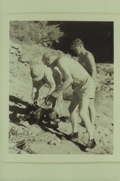 Study of Hance Rapid before running on the morning of June 15, 1950. Left to right: Forcier, Desloge, Marston, Ed Hudson, Edward Hudson and Taylor