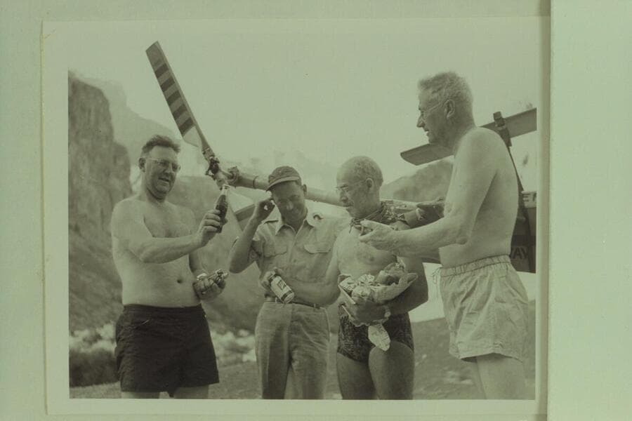 Red Carson arrived at Hance Rapids by helicopter bringing some light refreshment. Left to right: Ed Hudson, Carson, Marston and Desloge