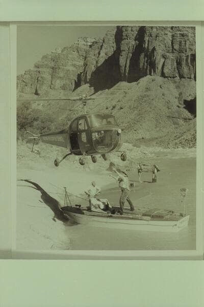 Red Carson piloting the helicopter over the "Esmeralda" at the head of Hance Rapid. Joe Desloge and Ed Hudson are in the boat. Marston and Taylor in the background
