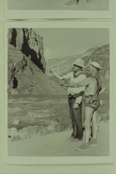 Hudson and Marston pose for the photographer to illustrate the business of studying a rapid before running it; Hance Rapid