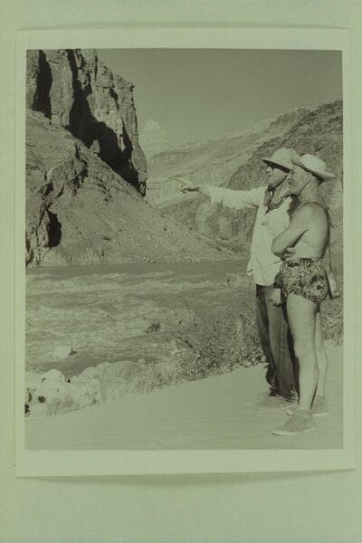 Hudson and Marston pose for the photographer to illustrate the business of studying a rapid before running it; Hance Rapid