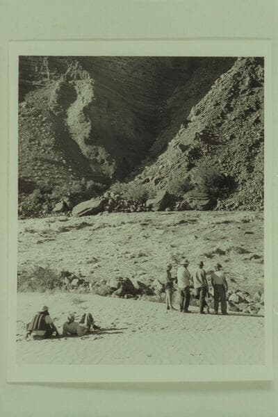 Study of Hance Rapid before running on the morning of June 15, 1950. Left to right: Forcier, Desloge, Marston, Ed Hudson, Edward Hudson and Taylor