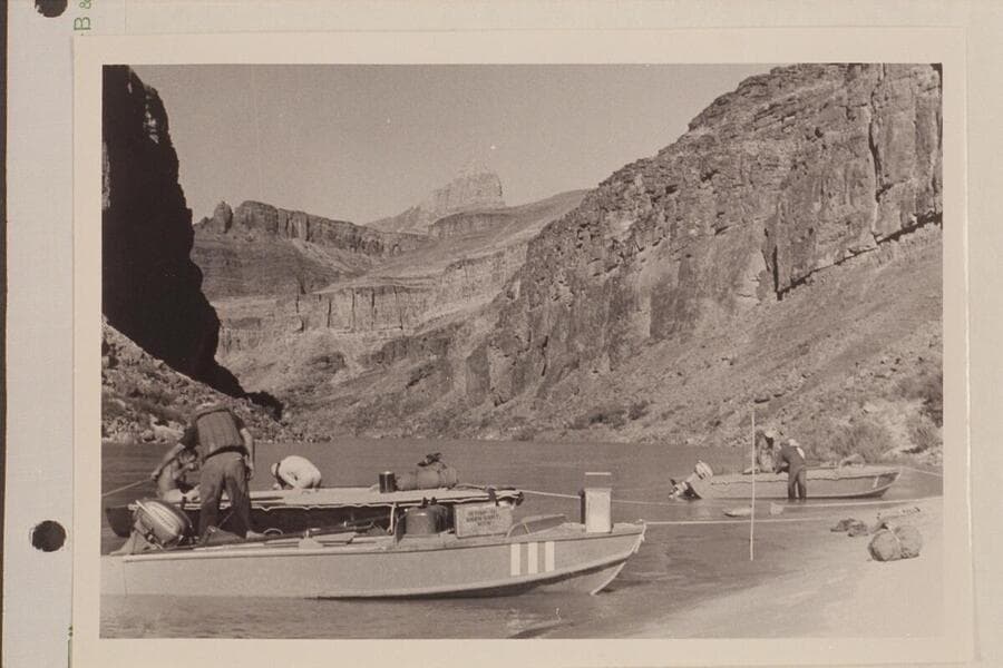 18-ft. Smith-Craft aluminum outboard boat used on Disney Reconnaissance run through Grand Canyon in 1953, June. Lees Ferry