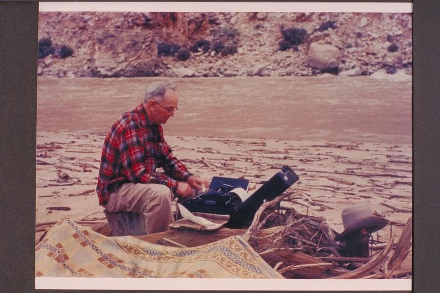 Randall Henderson pounds out his daily story during the Grand Canyon traverse of 1947