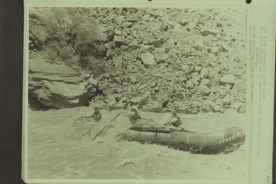 Don Hatch pontoon in Hance Rapid. Don Hatch at the bow in operation which they designate as coxswain. Clark and Bruce Lium at the oars