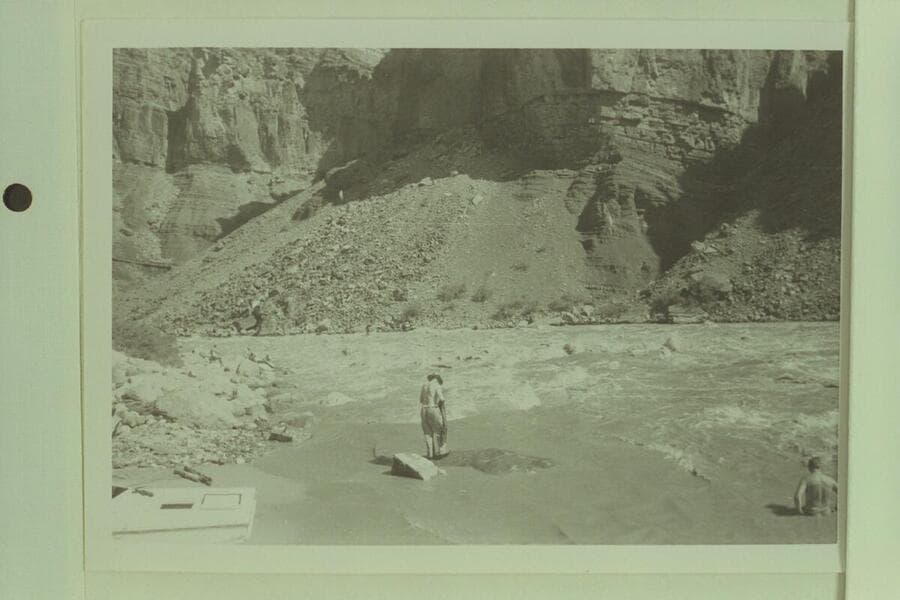 Beaching the sadiron after portage and lining Wright-Stavely party at Hance Rapid