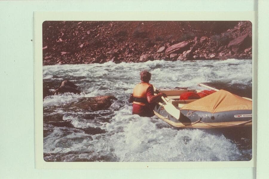 Nosing the small inflated craft at Hance Rapid; Ed Herrman, Howard Booth and Jorgen Visbak