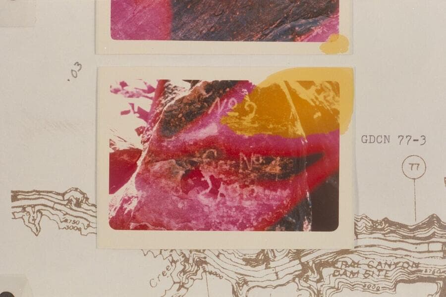 Inscriptions at right bank below Hance Rapid; Mile 77.1-77.5. Probably location markers for the Hance Mine