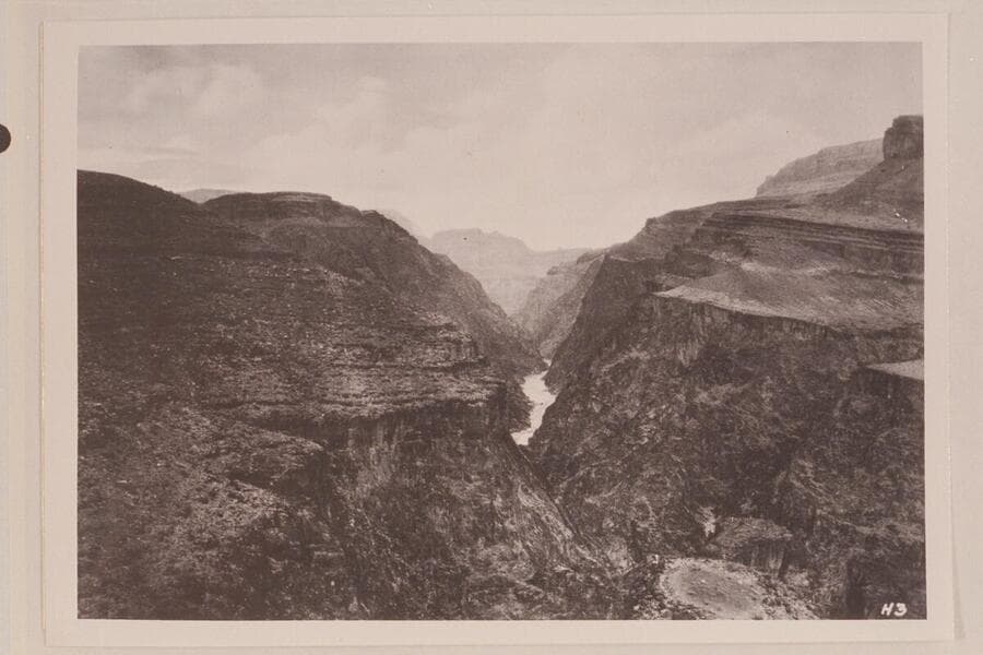 Looking down upper Granite Gorge to Sockdologer Rapid from cliff above Mineral Creek. Photo No. H3 in Lint album