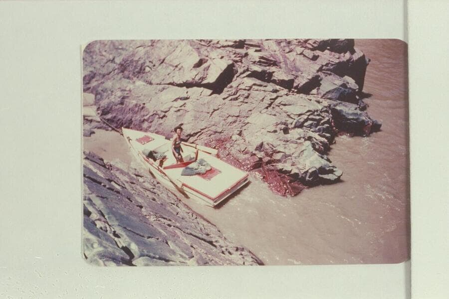 Susie Reilly in the "Galloway," 2/3 of the way down Sockdologer Rapid. Bright Angel gauge: 15,000 cfs