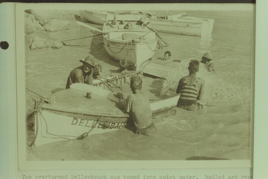The overturned "Dellenbaugh" was towed into quiet water, bailed and repaired
