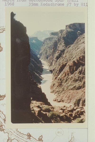 Upriver from directly above Grapevine Rapid. Route of Spur Trail appears. The sun lights the saddle