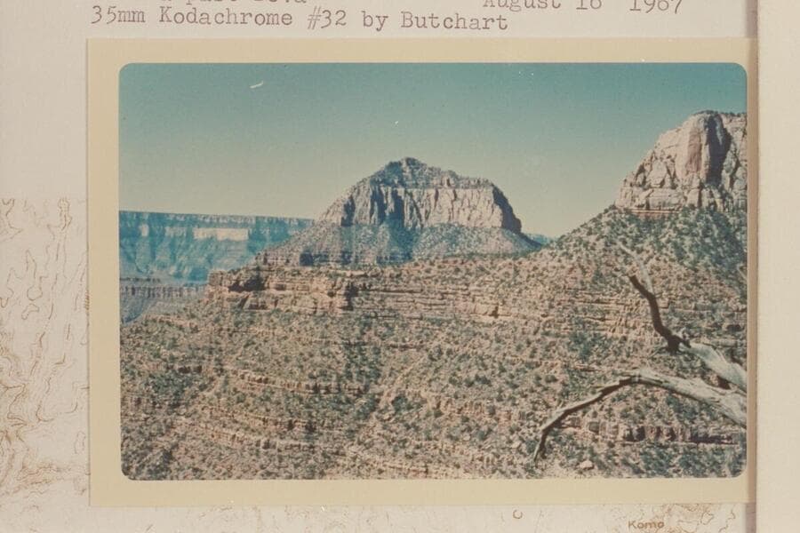 Deva Temple from Howlands Pass east of Howlands Butte. Route up Redwall north of Deva, then east and up past Obi Point
