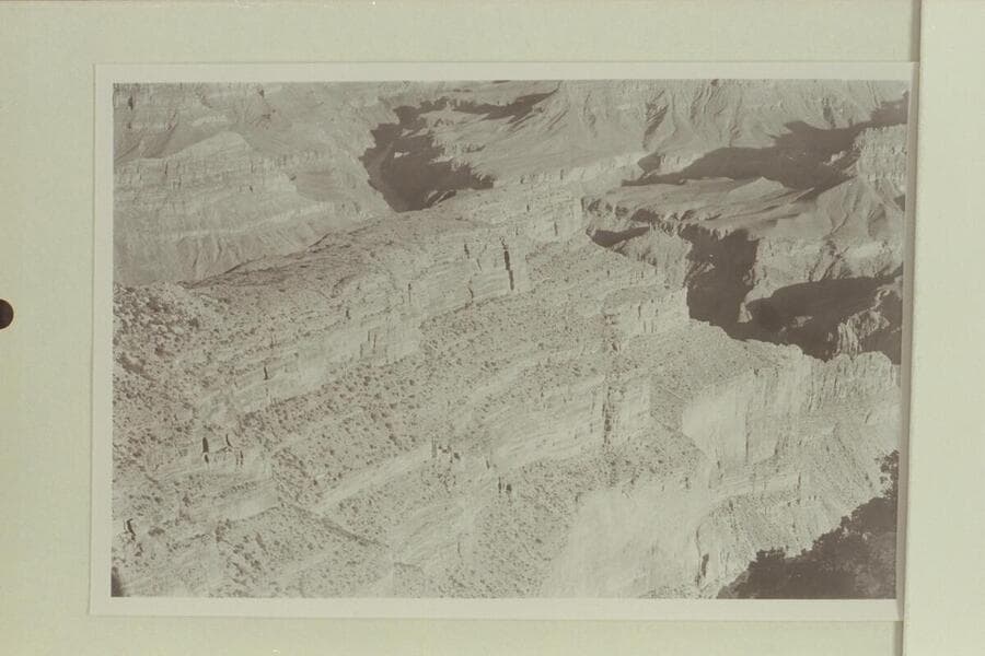 Down the Grand Canyon from Hopi Point. The butte which heads out into the center of the picture from lower left is The Alligator. Cope Butte is upper left. The canyon at lower right is The Inferno which heads Salt Creek