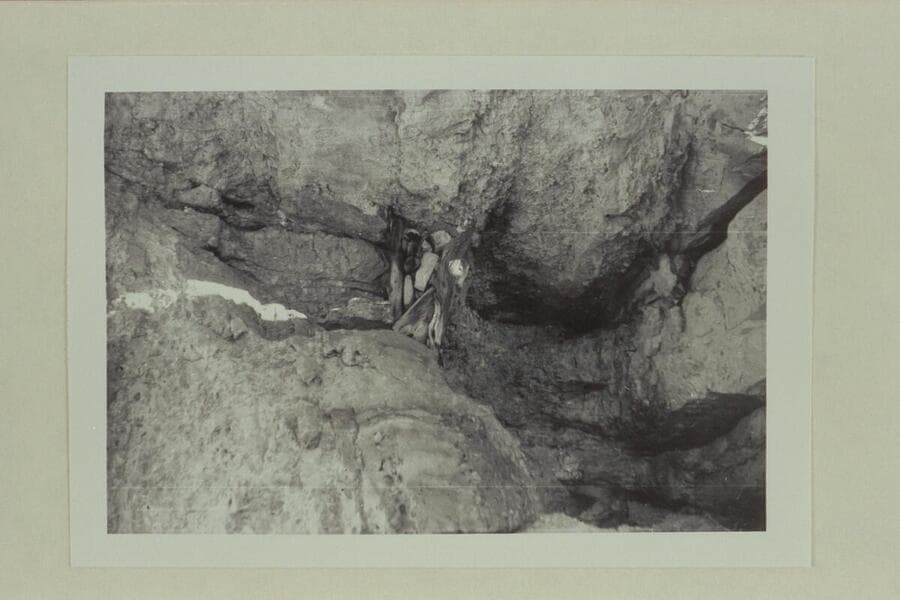 Small platform for dwelling below rim at southwest corner of north rim campground. Trail leads down 80 ft. and around corner to north