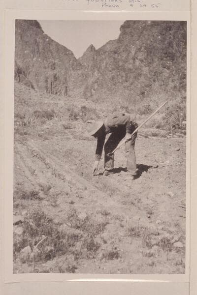 Israel Hoyt Chamberlain gardening near Camp Rust; Bright Angel Creek, Grand Canyon