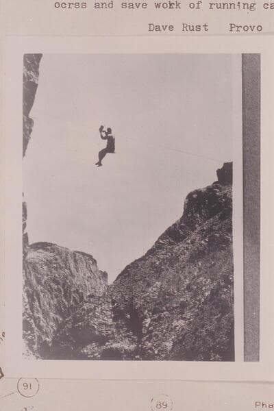 Israel Chamberlain riding a shieve [sic] on Rusts Cable. Method in common use to take one person across and save work of running cage. Winter
