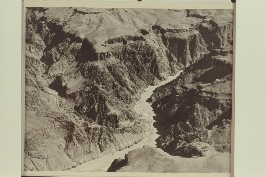 Suspension bridge; mouth of Bright Angel Creek from Sumner Butte