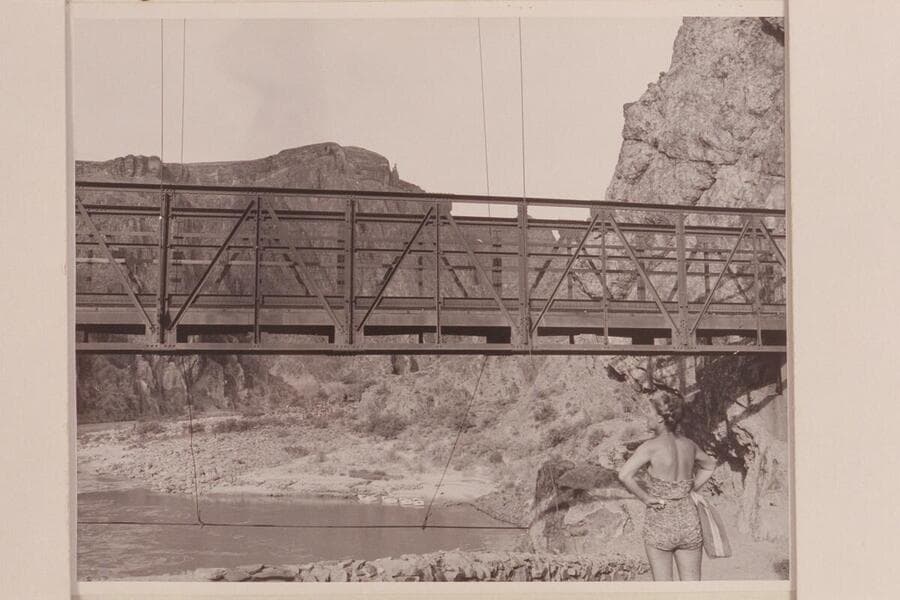 Margaret Marston at Suspension Bridge. Nevills boats in background