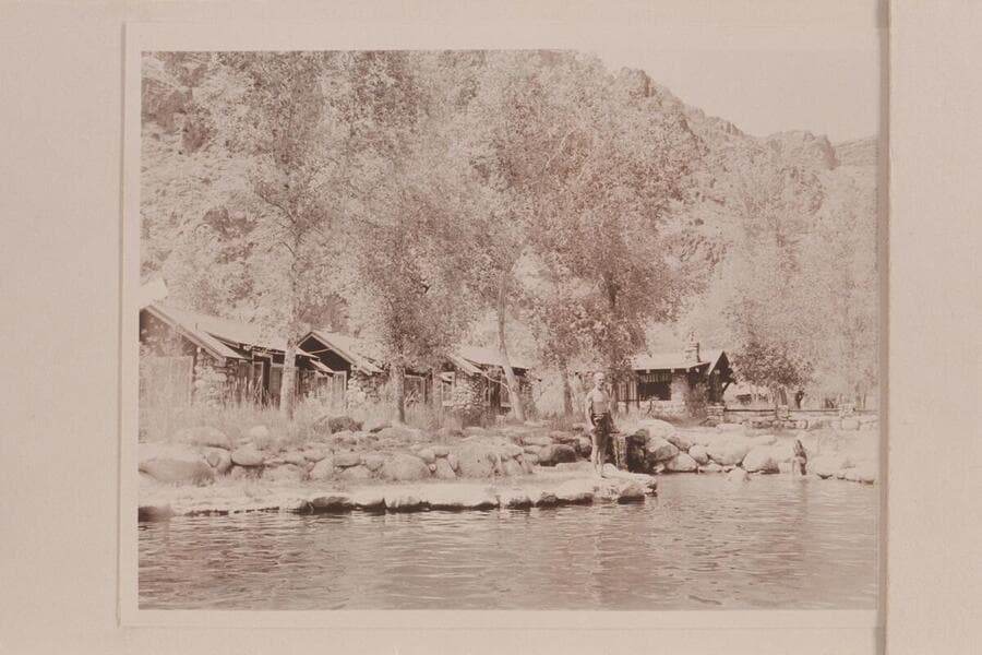The pool at Phantom Ranch. The cabins of the Ranch. Dock Marston at pool