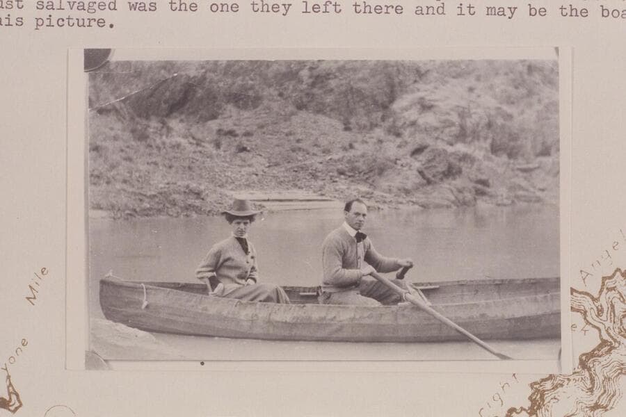 Ellsworth Kolb at the oars of Dave Rust's folding boat at the mouth of Bright Angel Creek. Marie is trying to remain calm while participating in Ellsworth's first boating experience