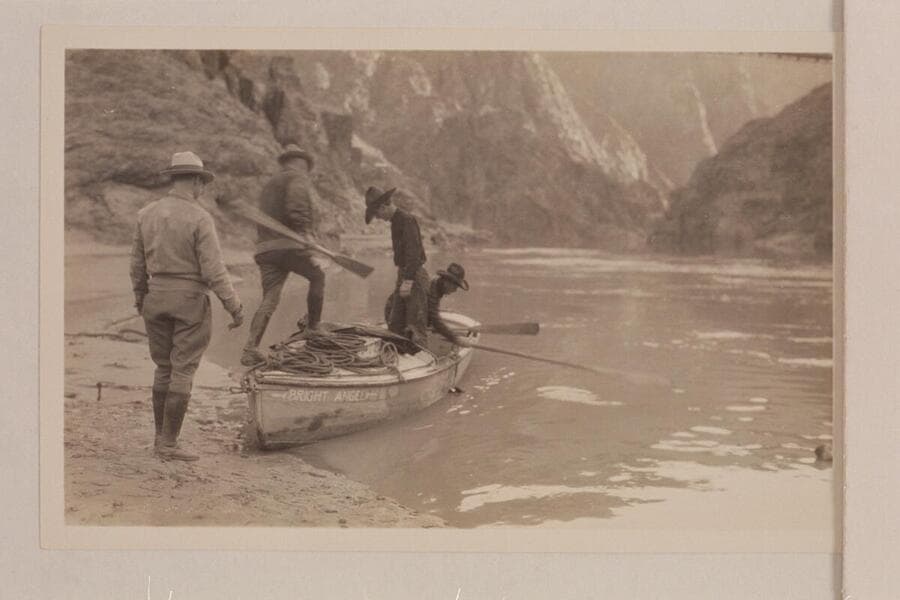 Wrangler and dudes stepping aboard the Pathe-Bray skiff "Bright Angel" for a swing around the eddy at Bright Angel Creek