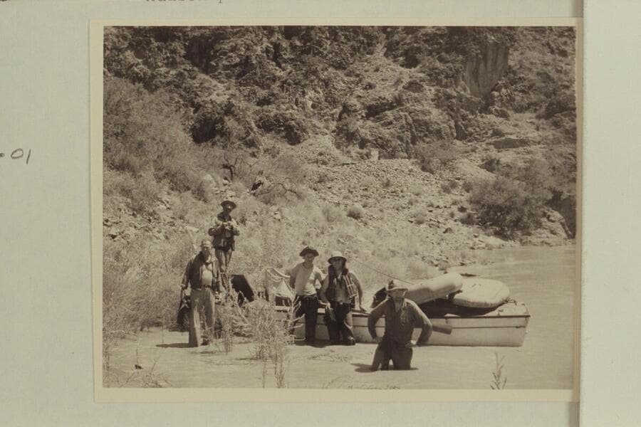 The "Esmeralda II" and her crew at Bright Angel Creek. Marston; Taylor; Edward Hudson; Ed Hudson; Robinson