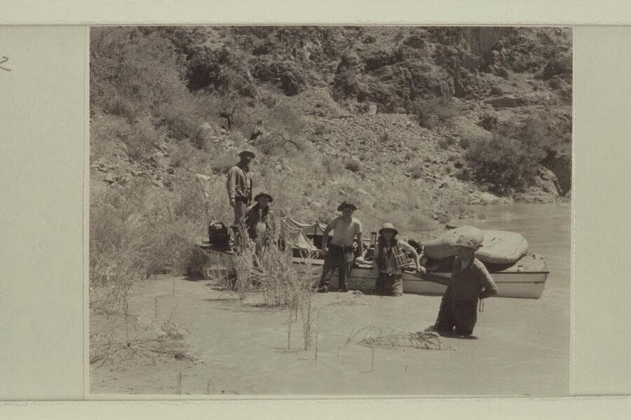 The "Esmeralda II" and her crew at Bright Angel Creek. Marston; Taylor; Edward Hudson; Ed Hudson; Robinson