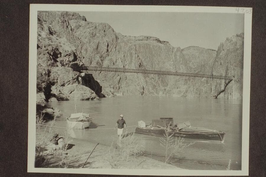 Ed and Edward Hudson posed on the "Esmeralda II"; Bright Angel Creek