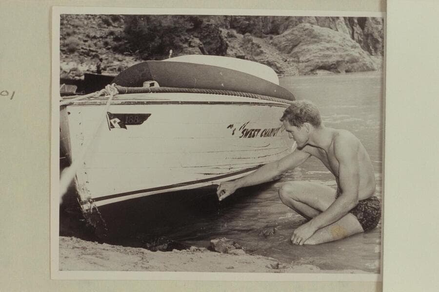 Cooper inspects the damage to the hull of "Sweet Chariot" which occurred in Hance Rapid; Bright Angel Creek