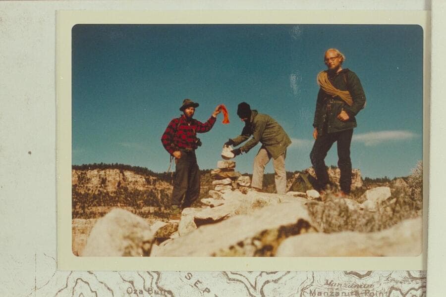 Donald G. Davis on summit of Brahma Temple. Isis and Shiva are at left and center