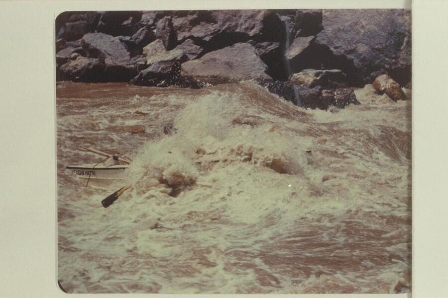 John Harper in the sadiron "Mexican Hat III." Top of Horn Creek Rapid. Bright Angel gauge: 8,750 cfs