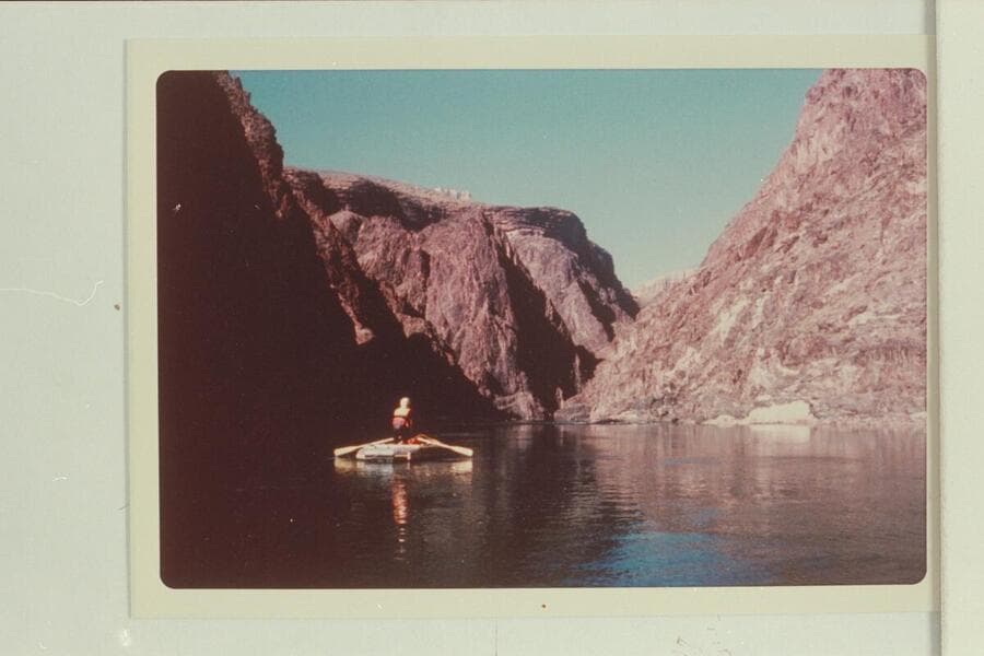 Nosing the small inflated craft at Hance Rapid; Ed Herrman, Howard Booth and Jorgen Visbak