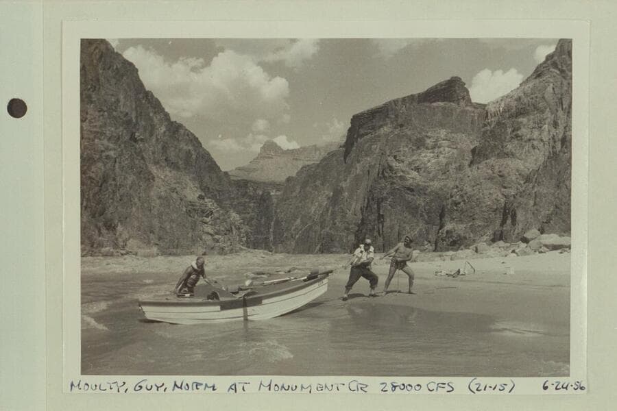 Guy Taylor Jr., Moulty Fulmer and Norm Day in the "GEM"; Mile 52.5 at foot of Nancoweap Rapid