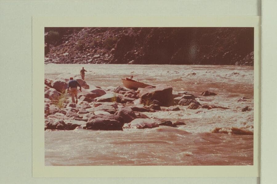 Repairs to "WEE RED" after Bill Austin piled onto the beach at Monument Creek Rapid