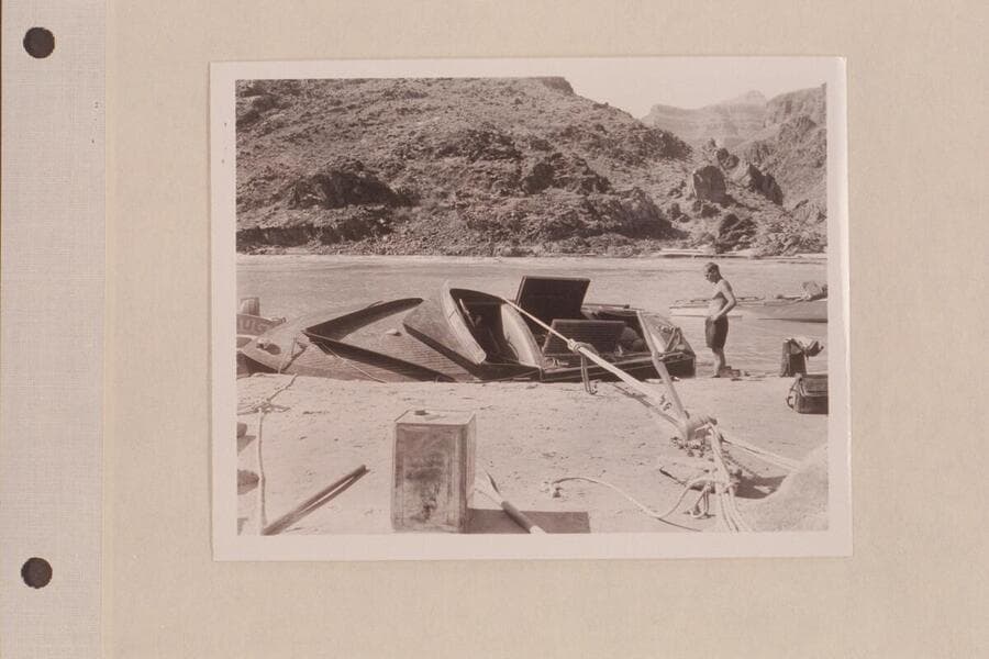 Boats of the 1951 motor run beached at Mile 94 to permit the repair to the "BOO" which was damaged in Granite Falls