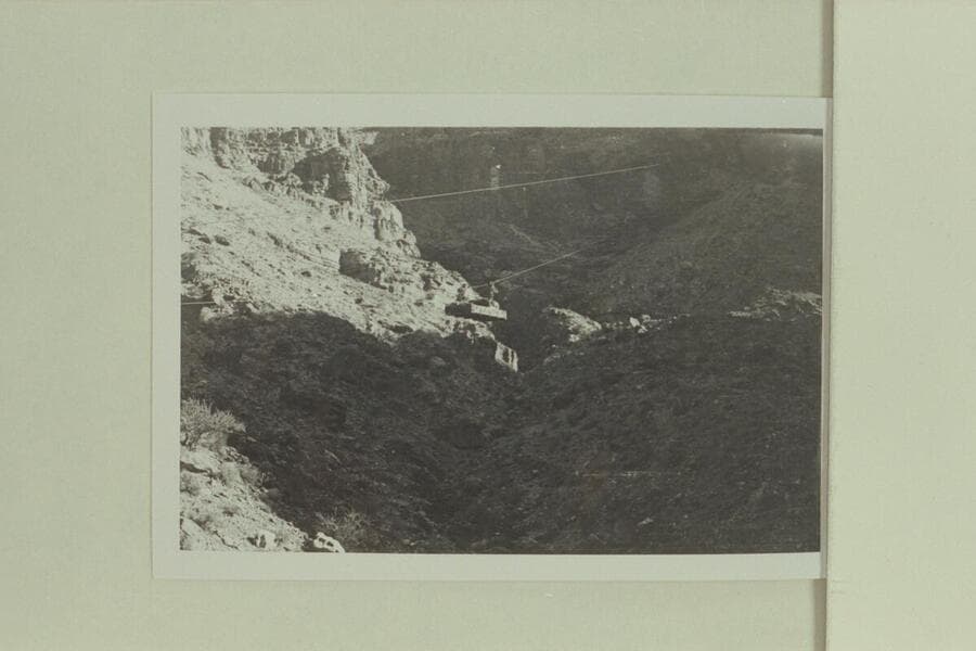 Johnny Maxson and the skip on the cable to Hermit Camp. Maxson and Campbell based at the old Hermit Camp for the study of the Archean in 1933