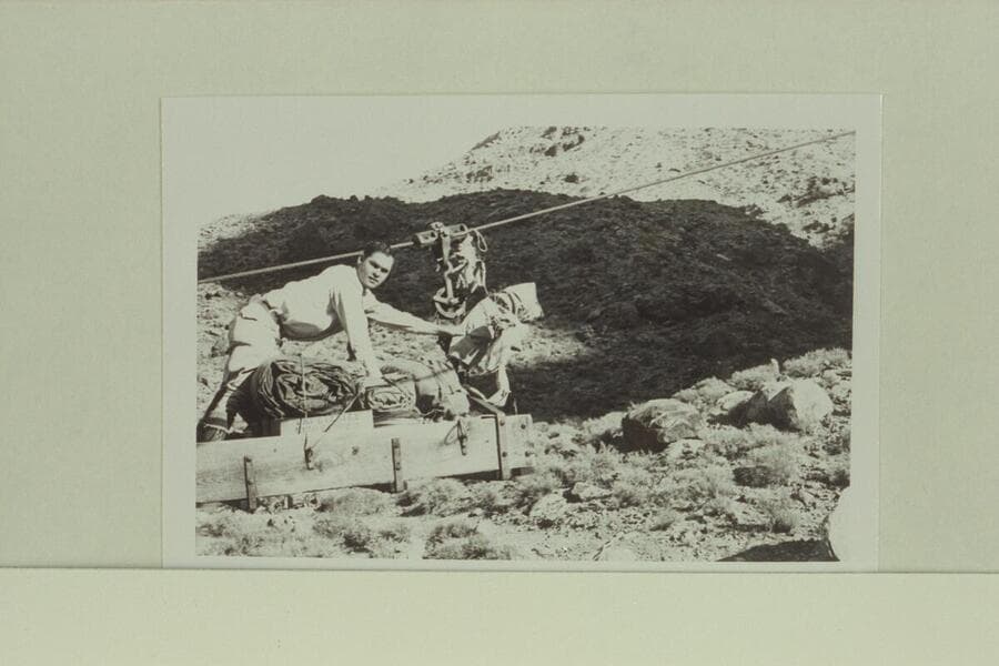 Johnny Maxson and the skip on the cable to Hermit Camp. Maxson and Campbell based at the old Hermit Camp for the study of the Archean in 1933