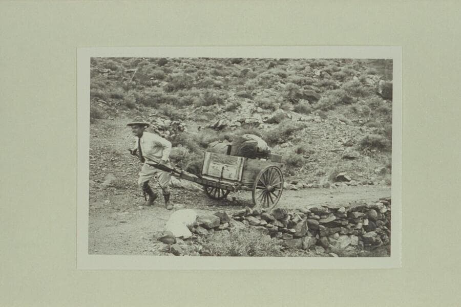 Johnny Maxson hauling dunnage from cable to cabins; Hermit Camp