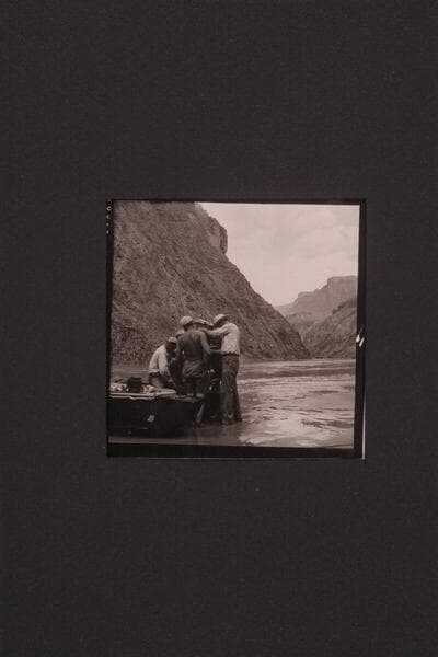 Motor repairs above Hermit Rapids; Don Harris, Bill Belknap, Claude Nichols, Rod Sanderson and John Riffey