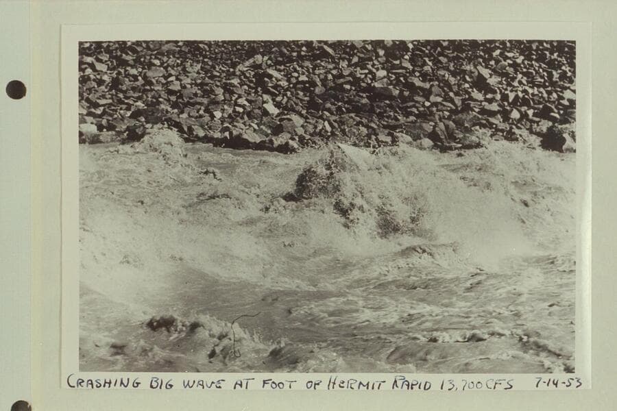 P. T. Reilly in a Reynolds sadiron riding the big wave at the foot of Hermit Rapid